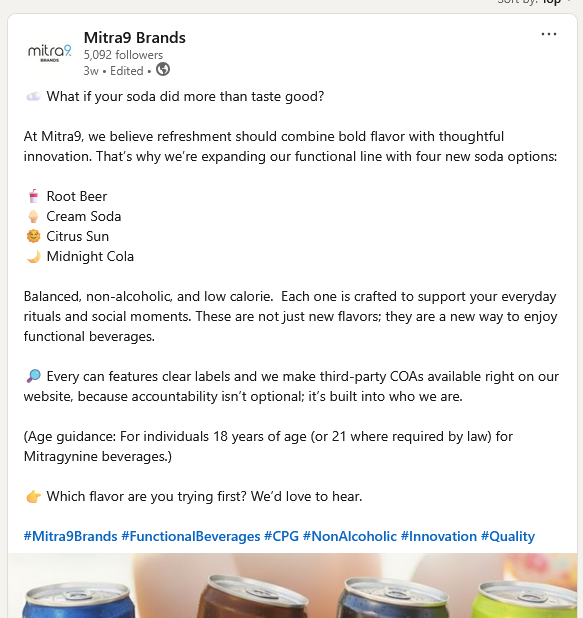Mitra9 is a Florida-based functional beverage company known for its botanical seltzers and kava-based drinks that promote relaxation without alcohol. The brand blends modern lifestyle marketing with plant-based wellness to connect with mindful, health-conscious consumers.